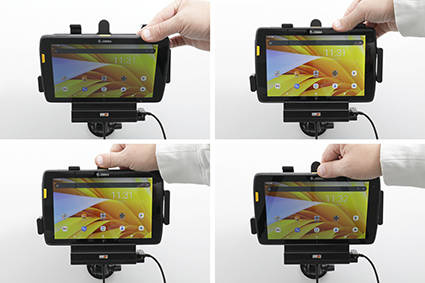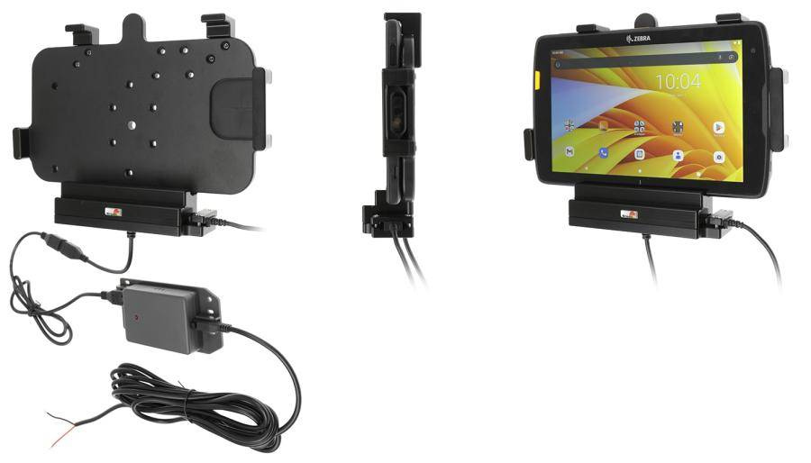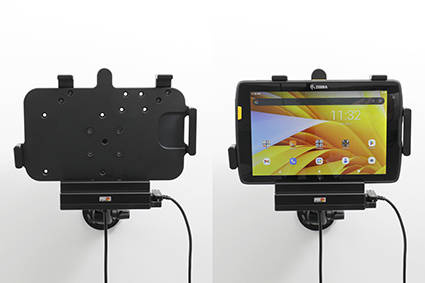 - 713323 - uchwyt aktywny o wzmocnionej konstrukcji z modułem komunikacyjno-ładującym do Zebra ET45 8.0. Jest specjalnie dopasowany do urządzeń, które nie są wyposażone w ochronną ramkę.