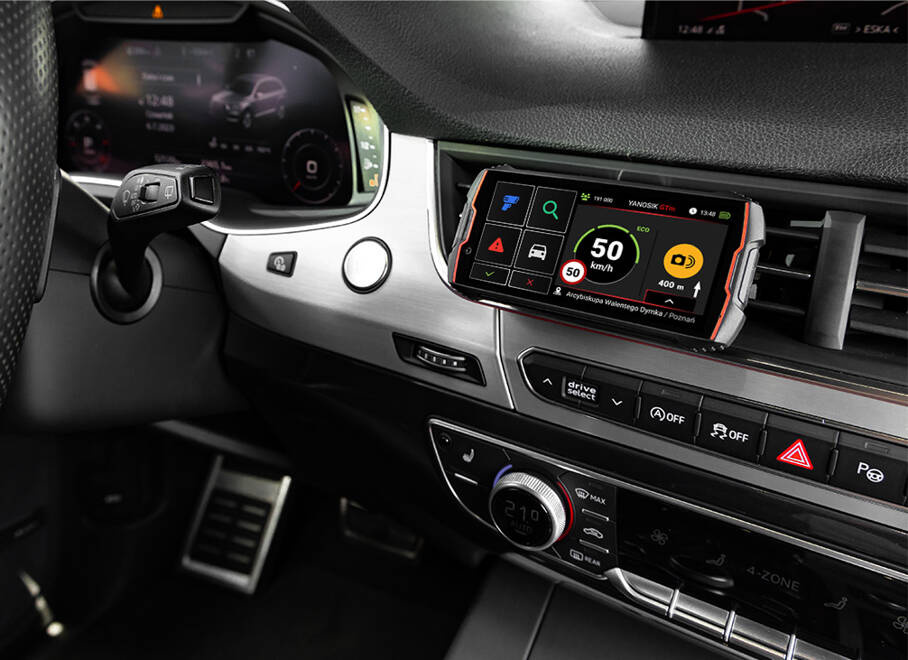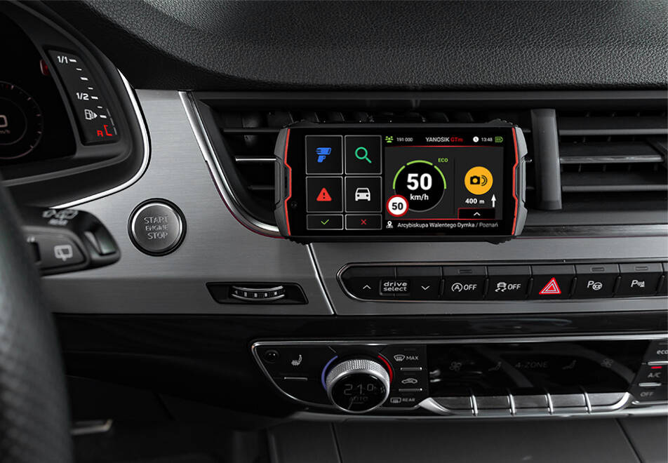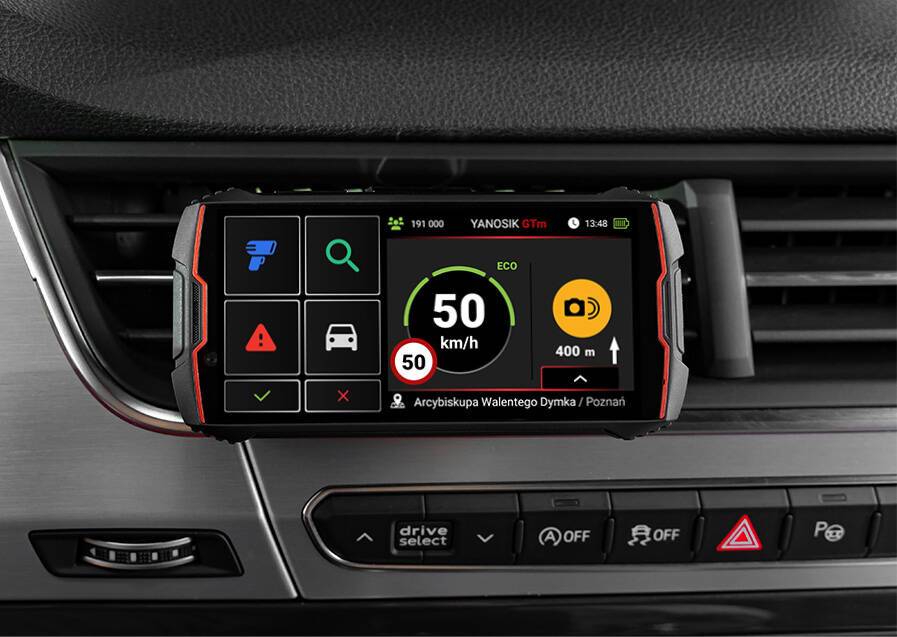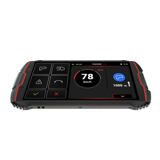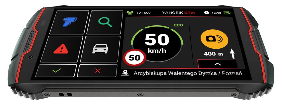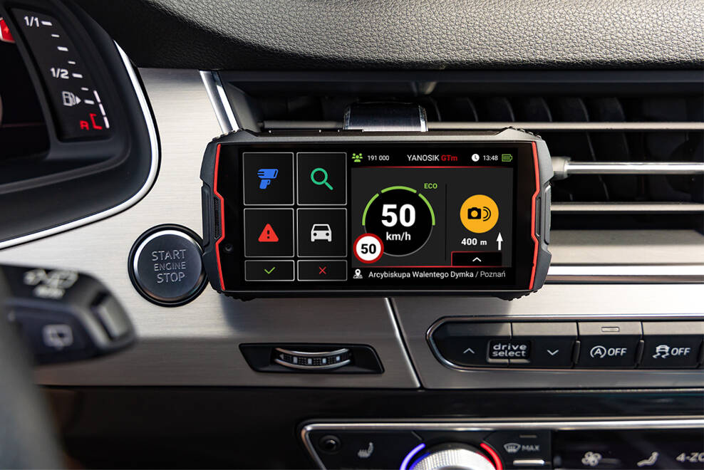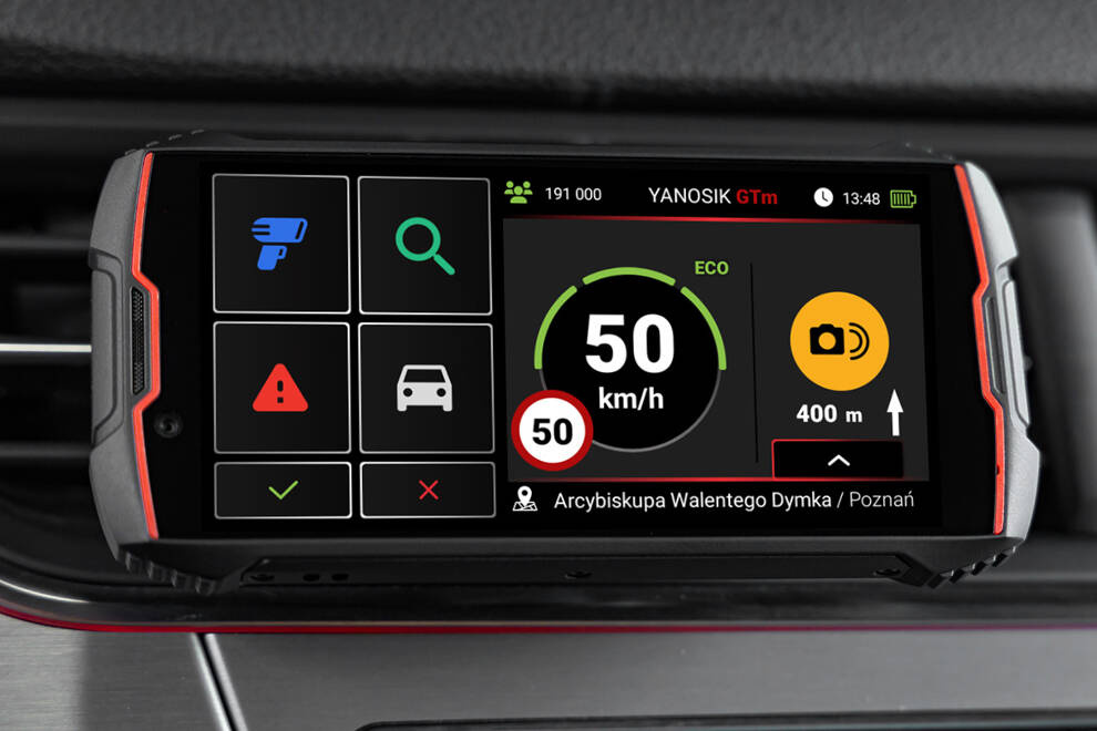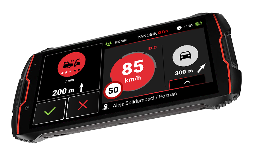 - Yanosik GTm obsługujesz dotykowo, dzięki czemu interakcja z urządzeniem jest znacznie płynniejsza. Możesz dodawać swoje zgłoszenia łatwo i przyjemnie przez panel dotykowy.