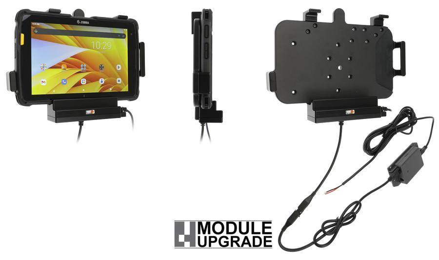 - 713324 - uchwyt aktywny o wzmocnionej konstrukcji z modułem komunikacyjno-ładującym do Zebra ET45 8.0. Jest specjalnie dopasowany do urządzeń, które są wyposażone w ochronną ramkę.
