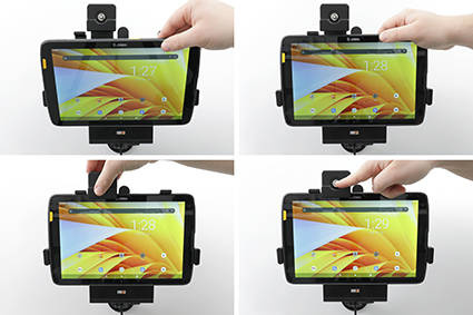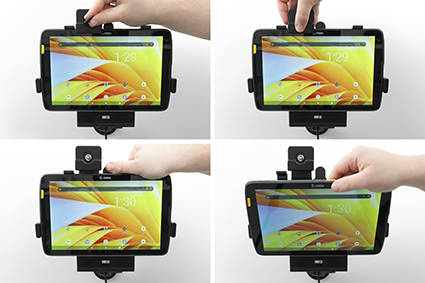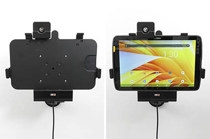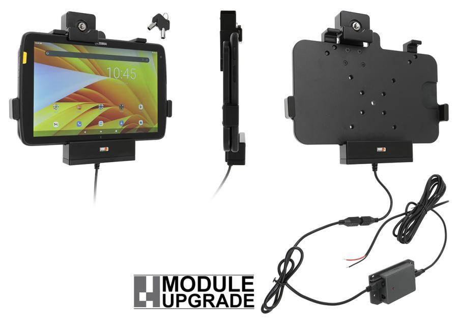 - 736319 - uchwyt aktywny o wzmocnionej konstrukcji z blokadą kluczykową do Zebra ET40 10.0. Jest specjalnie dopasowany do urządzeń, które nie są wyposażone w ochronną ramkę.