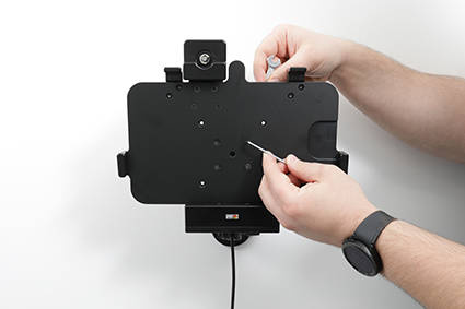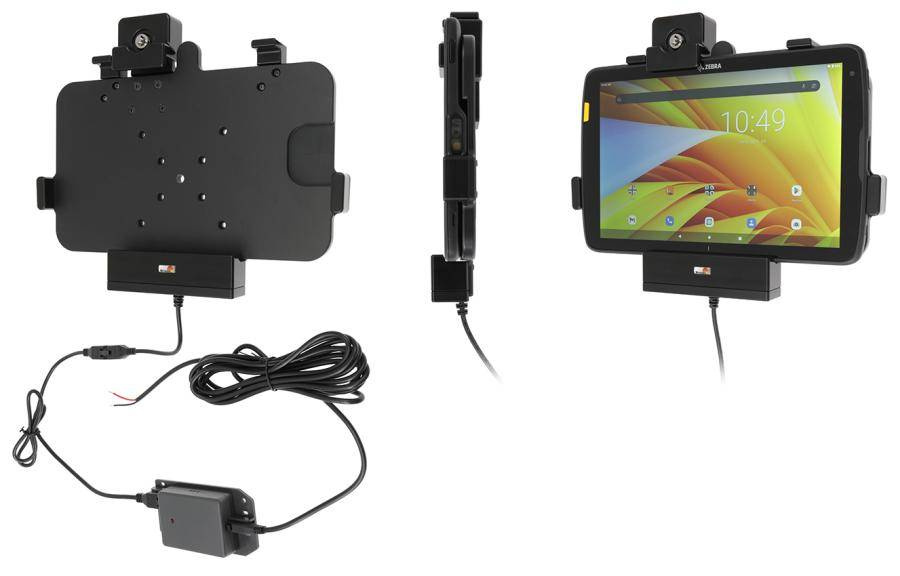 - 736319 - uchwyt aktywny o wzmocnionej konstrukcji z blokadą kluczykową do Zebra ET45 10.0. Jest specjalnie dopasowany do urządzeń, które nie są wyposażone w ochronną ramkę.