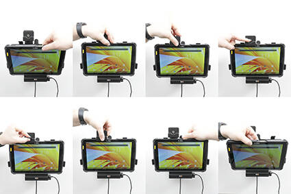 735326 - uchwyt aktywny o wzmocnionej konstrukcji do Zebra ET40 10.0 z blokadą kluczykową oraz obsługą urządzeń peryferyjnych. Jest specjalnie dopasowany do urządzeń, które są wyposażone w ochronną ramkę/egzoszkielet.