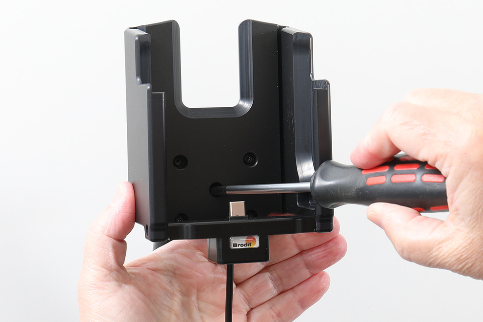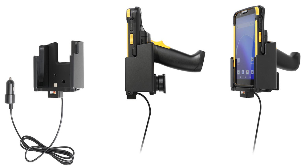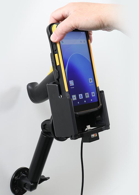 • Aktywny uchwyt do terminali CipherLab RS38 wyposażonych w gumową osłonę Protective Rubber Boot oraz chwyt pistoletowy. Dzięki regulacji kąta widzenia, uchwyt Brodit umożliwia wygodne korzystanie z terminala podczas ładowania.