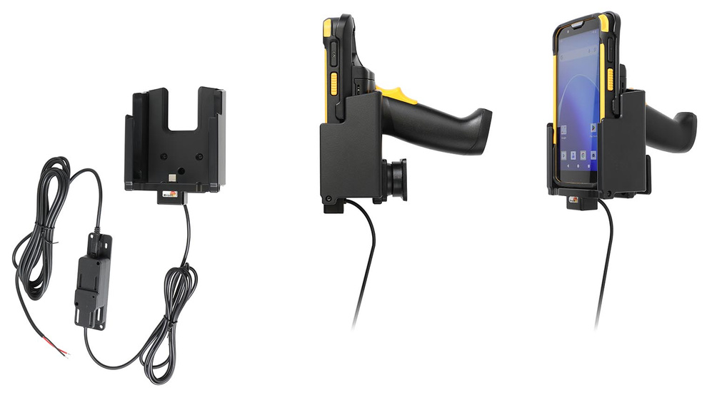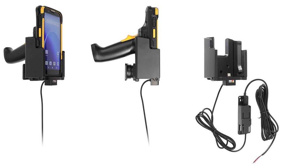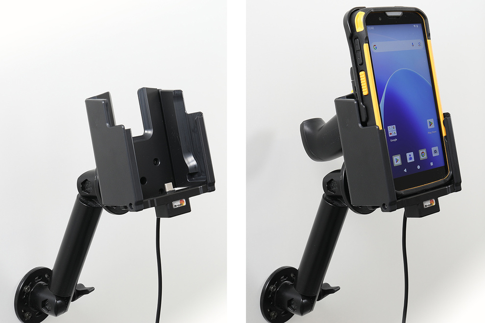 Aktywny uchwyt Brodit do stałego montażu na CipherLab RS38 w gumowym etui i z chwytem pistoletowym