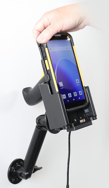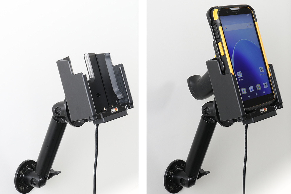 Aktywny uchwyt PogoPin Brodit do stałego montażu na CipherLab RS38 w gumowym etui i z chwytem pistoletowym