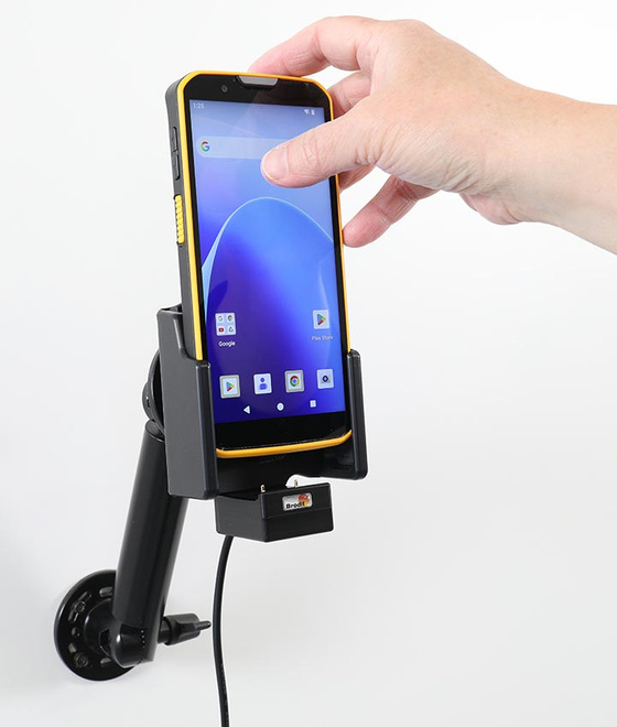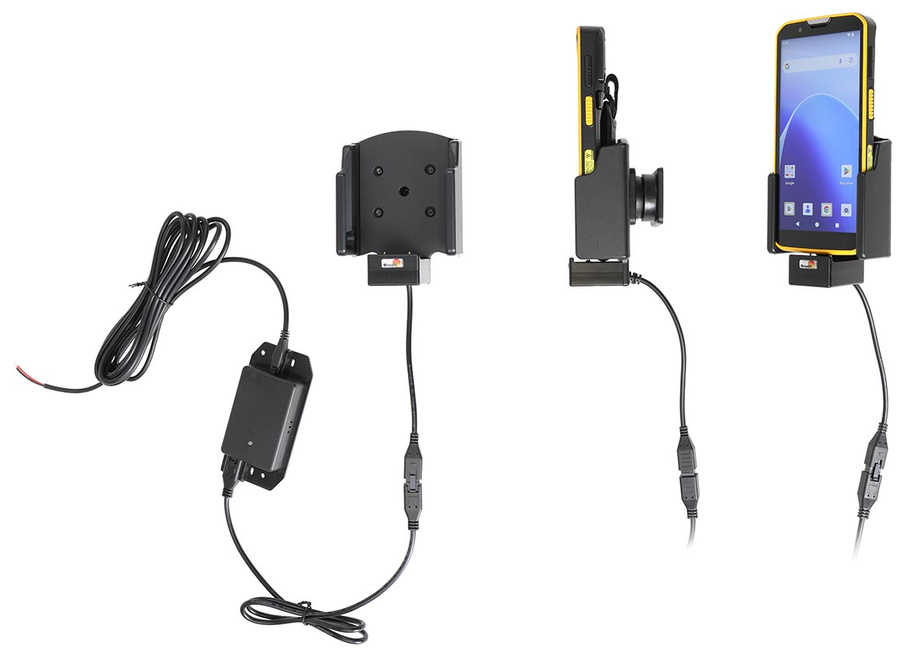 • Aktywny uchwyt do montażu stałego dla terminala CipherLab RS38 bez etui. Ładowanie 2,7 A z instalacji 12/24 V przez pogo-piny, regulacja kąta nachylenia i szybka wymiana dzięki Easy-Switching.