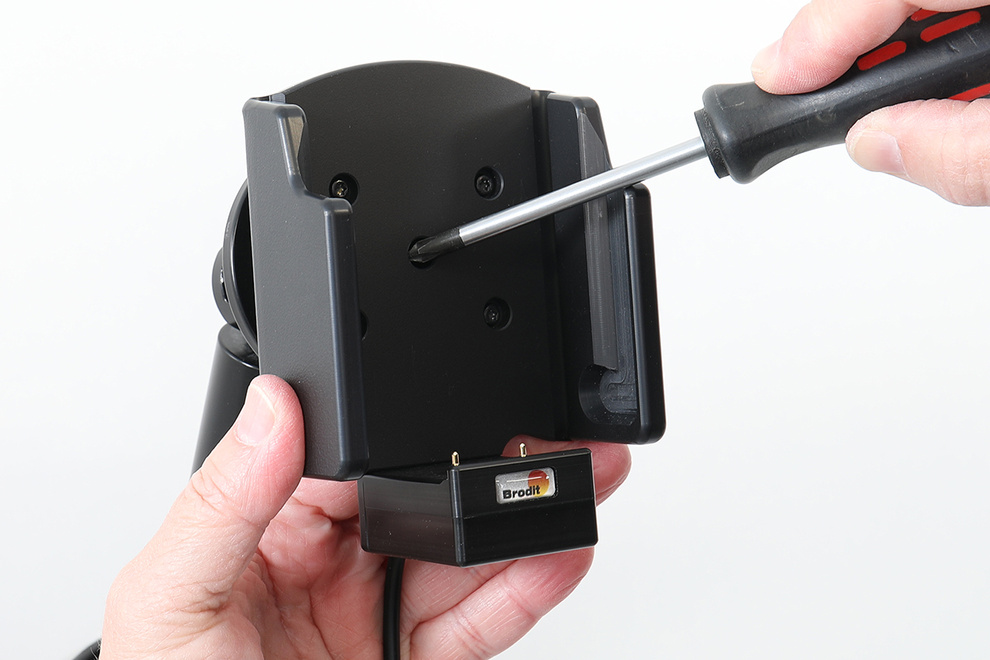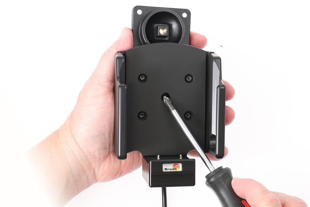 Ten specjalistyczny uchwyt aktywny został opracowany z myślą o montażu na stałe w pojazdach, zapewniając jednocześnie wygodę obsługi i stałe ładowanie urządzenia. Dzięki wbudowanemu zasilaniu 2,7 A, kompatybilnemu z instalacjami 12 V i 24 V, akumulator pozostaje w pełni naładowany w czasie jazdy. Rozwiązanie bazujące na stykach pogo pins gwarantuje pewne i stabilne połączenie, które nie obciąża mechanicznie gniazda ładowania i doskonale sprawdza się przy intensywnym, codziennym użytkowaniu.