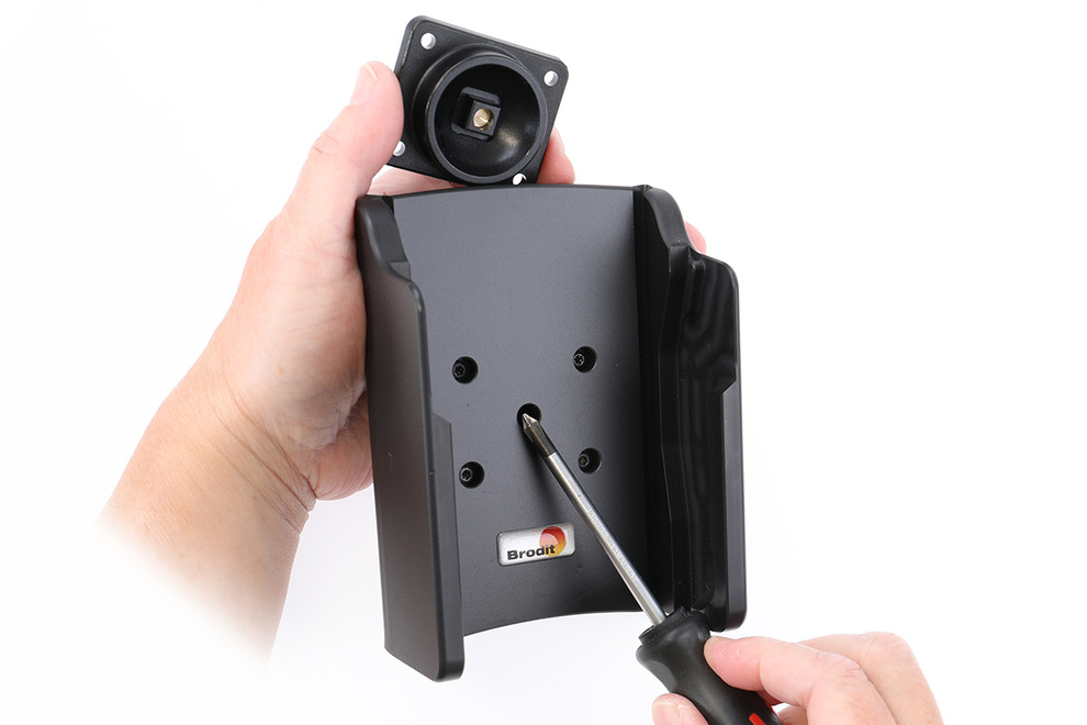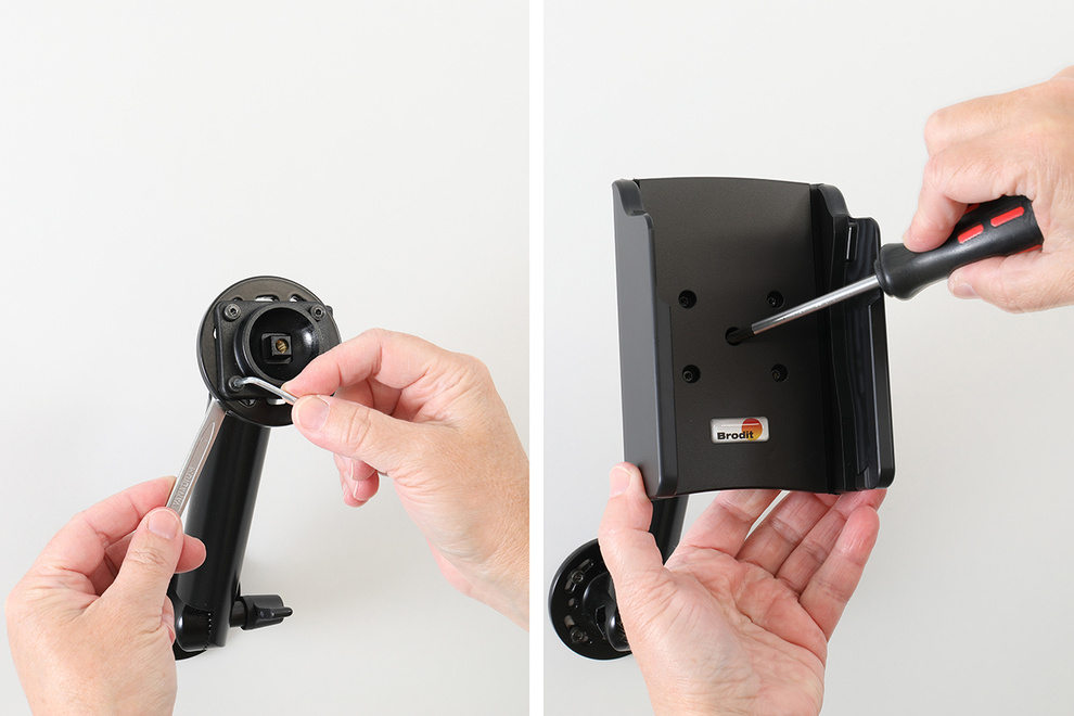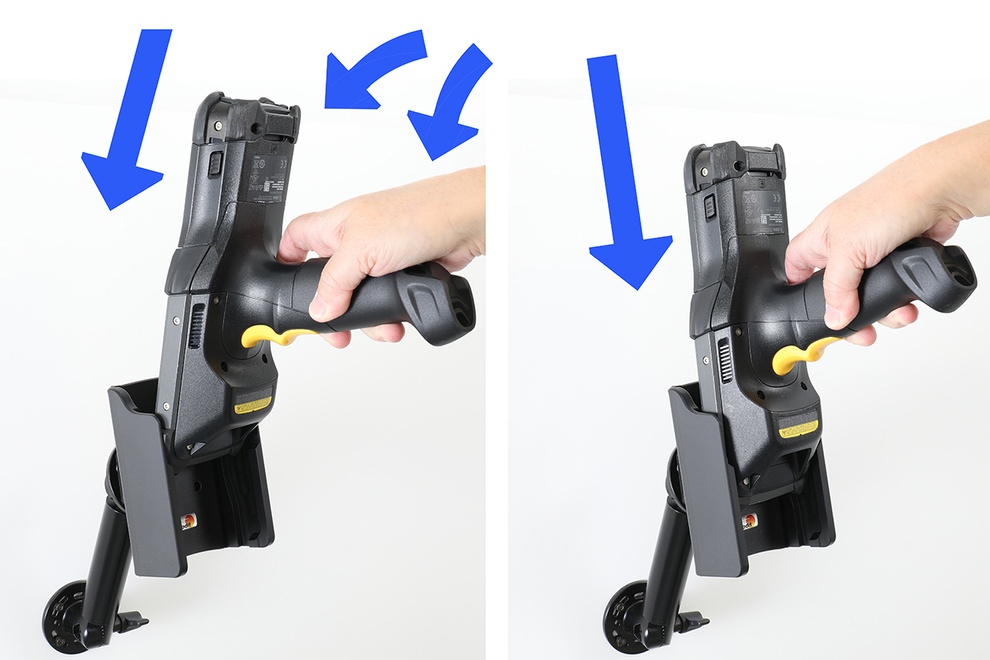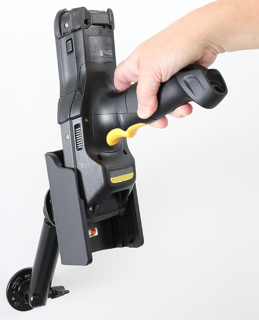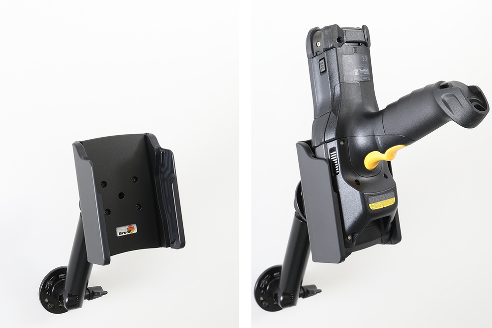 - System montażowy do terminali Zebra MC9300 i MC9400 z rękojeścią pistoletową. Urządzenie wsuwane jest wyświetlaczem do środka, co ułatwia szybkie odkładanie i wyjmowanie jedną ręką. Zintegrowana regulacja zapewnia odchylenie 17° oraz obrót 360°.