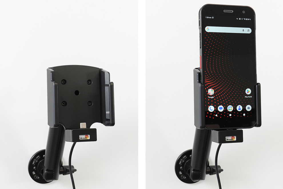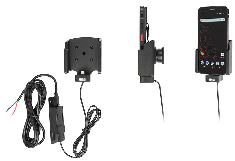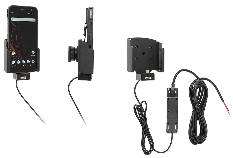 Samochodowy uchwyt ładujący z przewodowym zasilaniem stałym jest przeznaczony do zabudowy w pojeździe w sposób uporządkowany i dyskretny. Zamiast doraźnych ładowarek i przewodów prowadzonych po kokpicie otrzymujesz rozwiązanie, w którym tor zasilania jest poprowadzony na stałe, a urządzenie po włożeniu do uchwytu zostaje ustabilizowane w pozycji pionowej. Taki sposób ekspozycji ekranu ułatwia szybki podgląd informacji, a jednocześnie wspiera bezpieczniejsze korzystanie z terminala w warunkach pracy mobilnej. Uchwyt zaprojektowano tak, aby dokowanie i wyjmowanie jedną ręką było możliwe również wtedy, gdy terminal jest używany z paskiem na dłoń lub bez niego.