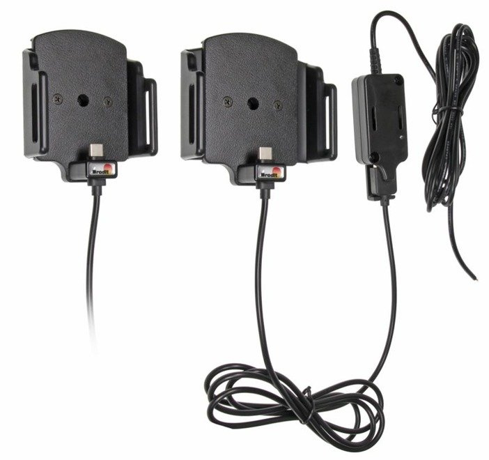 • 527843 - uchwyt uniwersalny aktywny do instalacji na stałe z głowicą obrotową, adapterem Molex oraz 2A ładowarką z wtykiem USB-C do smartfonów bez futerału oraz w futerale lub etui o wymiarach: 75-89 mm (szer.), 6-10 mm (grubość).