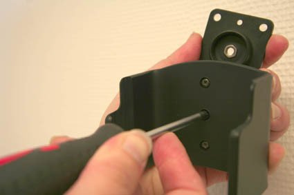 - Umieść uchwyt na płytce montażowej głowicy obrotowej w taki sposób, aby można było dokręcić śrubę znajdującą się w centralnej części uchwytu. Śrubę należy dokręcić dość mocno, a następnie lekko poluzować, aby możliwa była regulacja uchwytu.