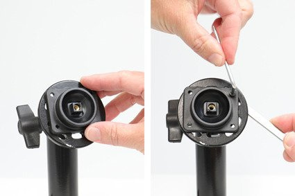 - Umieść uchwyt na płytce montażowej głowicy obrotowej w taki sposób, aby można było dokręcić śrubę znajdującą się w centralnej części uchwytu. Śrubę należy dokręcić dość mocno, a następnie lekko poluzować, aby możliwa była regulacja uchwytu.