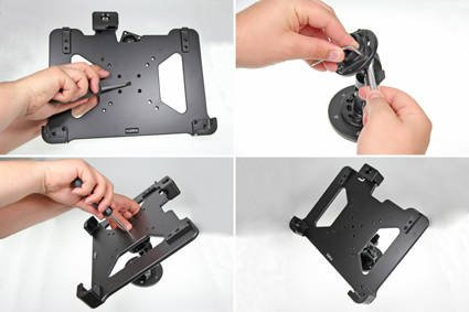 Uchwyt wyposażony jest w głowicę obrotową, która umożliwia jego regulację w różnych kierunkach w celu np. uniknięcia odbicia światła na ekranie. Możesz regulować ustawienie uchwytu o 22° w każdym kierunku. Uchwyt umożliwia jednocześnie ustawienie tabletu w pionie lub w poziomie. Zamontuj swój uchwyt do tabletu na ProClip’ie samochodowym lub na specjalnym uchwycie montażowym do zagłówka.