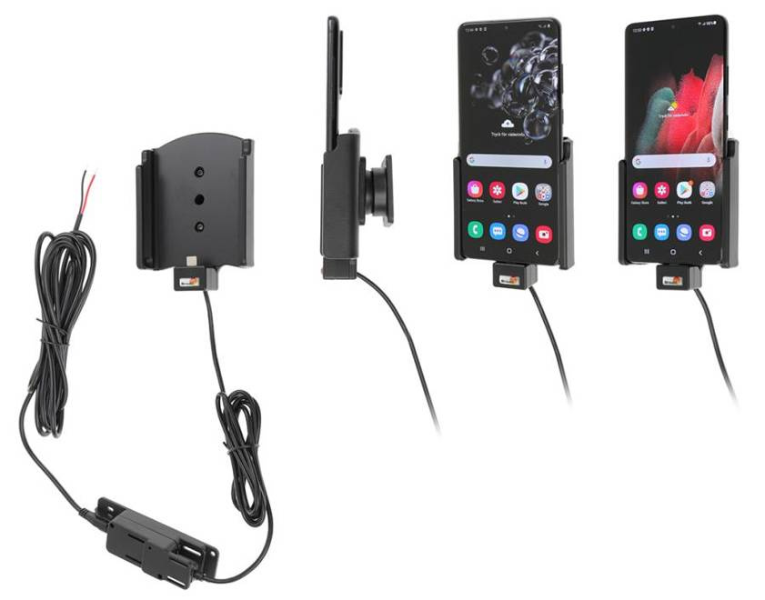 • 727192 - uchwyt aktywny do instalacji na stałe z głowicą obrotową, adapterem Molex oraz 2A ładowarką do Samsung Galaxy S21 Ultra.