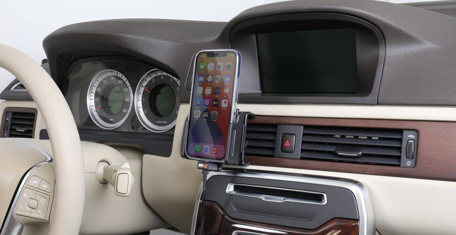 Uchwyt aktywny z kablem USB do Apple iPhone 12 w futerale lub bez o wymiarach: 70-83 mm (szer.), 6-10 mm (grubość).