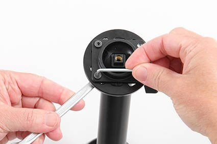 3. Umieść uchwyt na płytce montażowej głowicy obrotowej w taki sposób, aby można było dokręcić śrubę znajdującą się w centralnej części uchwytu. Śrubę należy dokręcić dość mocno, a następnie lekko poluzować, aby możliwa była regulacja uchwytu.
