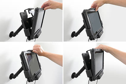 Uchwyt został wykonany z bardzo mocnego i wytrzymałego tworzywa ABS. Zamontuj go do dowolnej płaskiej powierzchni, w samochodzie ciężarowym, w magazynie, na wózku widłowym itp. Uchwyt posiada w swojej tylnej części standardowe otwory AMPS i VESA. Uchwyt nie ogranicza dostępu do kamery, wszystkich przycisków funkcyjnych i portów elektronicznych.