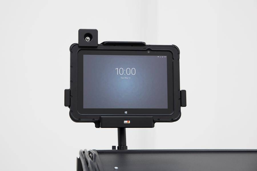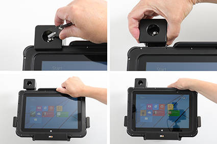 - 739266 - modułowy uchwyt o wzmocnionej konstrukcji do Zebra ET55 10.1 z blokadą kluczykową. Jest specjalnie dopasowany do urządzeń, które są wyposażone w ochronną ramkę oraz dodatkowy pasek na rękę.