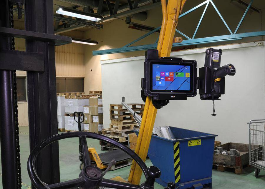 Uchwyt został wykonany z bardzo mocnego i wytrzymałego tworzywa ABS. Zamontuj go do dowolnej płaskiej powierzchni, w samochodzie ciężarowym, w magazynie, na wózku widłowym itp. Uchwyt posiada w swojej tylnej części standardowe otwory AMPS i VESA. Uchwyt nie ogranicza dostępu do kamery, wszystkich przycisków funkcyjnych i portów elektronicznych.
